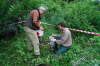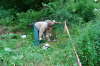 28.06.2008: Damit der Vermesser auch das ganze Grundstück betreten kann und nicht auf den zu bebauenden Teil beschränkt ist, habe ich mit Jasmin heute auch den späteren Gartenteil des Grundstücks gerodet. Mit einem Freischneider und vielen Litern Wasser haben wir den ganzen Unterbewuchs entfernt. Eine Pappel, die von innen schon morsch war, haben wir auch noch entfernt. Da wir aber keine Kettensäge mitgenommen hatten, fingen wir an mit der Bügelsäge und der Axt den Baum zu fällen. Ein freundlicher Nachbar kam vorbei und hat uns den Baum fachgerecht umgelegt. Vielen Dank an den Nachbarn vom Forstbetrieb.