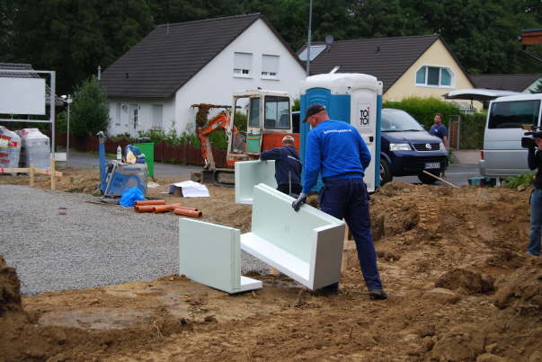Die ersten Randelemente werden verlegt und am Schnurgerüst ausgerichtet.