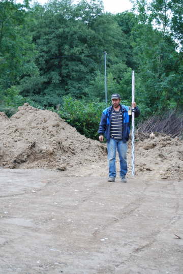 Mit dem Rotationslaser wird ständig die Höhe der Aufschotterung kontrolliert. Das Maß für die Oberkante Schotter ist durch den Vermesser festgelegt.