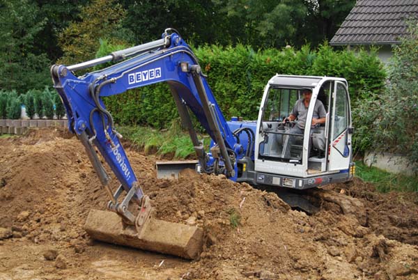13.09.2008: 2. Bautag: Heute kam der Bagger voll zum Einsatz. Jörg hat die gesamte Baugrube ausgeschachtet. Erst kam der Boden runter, dann wurde auch noch der Lehm weggebaggert. Wir haben jetzt ein großes Loch da, wo mal der Urwald von Borneo war! Mit dem Abraum hat er den tiefer liegenden “Garten” aufgefüllt.