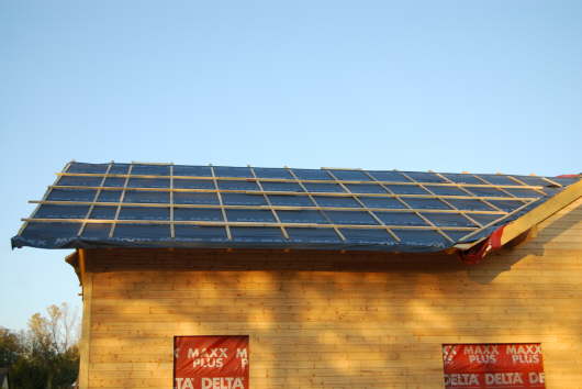 Die Delta-Folie und die Konterlattung sind drauf. Die waagerechten Latten sind nur zum Laufen.