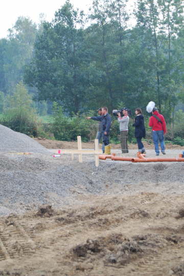 Die Arbeit muß ja auch dokumentiert werden. Also werden die wichtigsten Arbeitsschritte vom Fernsehen begleitet. Hier die Qualitätskontrolle der verdichteten Bodenplatte.